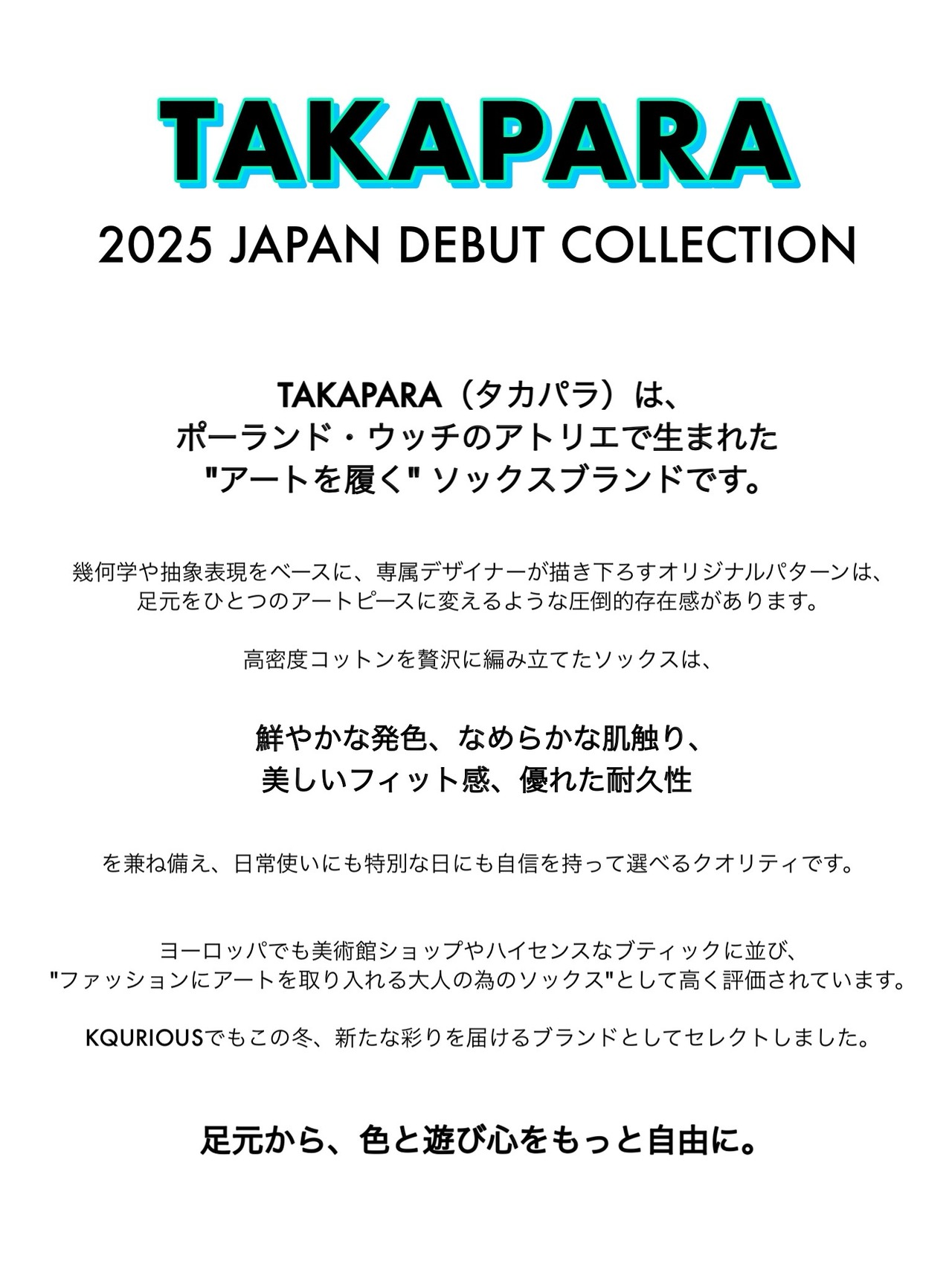 < TAKAPARA >は、ポーランド・ウッチのアトリエから生まれた、「アートを履く」ことをコンセプトにしたソックスブランドです。