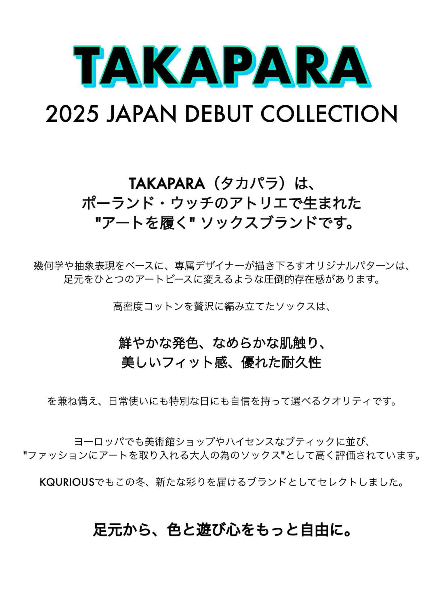 < TAKAPARA >は、ポーランド・ウッチのアトリエから生まれた、「アートを履く」ことをコンセプトにしたソックスブランドです。